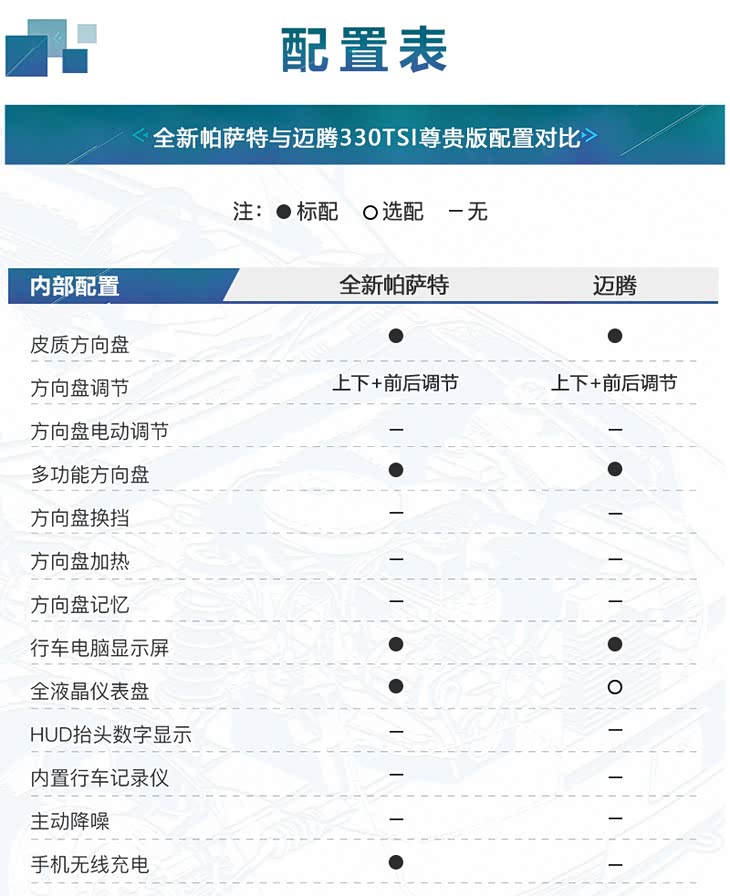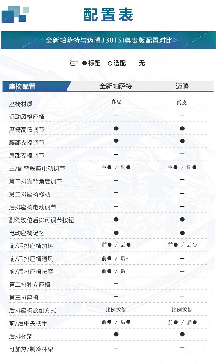 2019款330TSI尊贵版全新帕萨特和2019款330TSI尊贵版迈腾在外部/放到配置中,两款车型配置均保持一致,没有任何差别。而在内部配置中,全新帕萨特要比迈腾多全液晶仪表盘和手机无线充电,但是全液晶仪表盘在迈腾中可选装。在座椅配置中,全新帕萨特带有前后排座椅加热、前排座椅通风和按摩,而迈腾只有前排座椅加热。