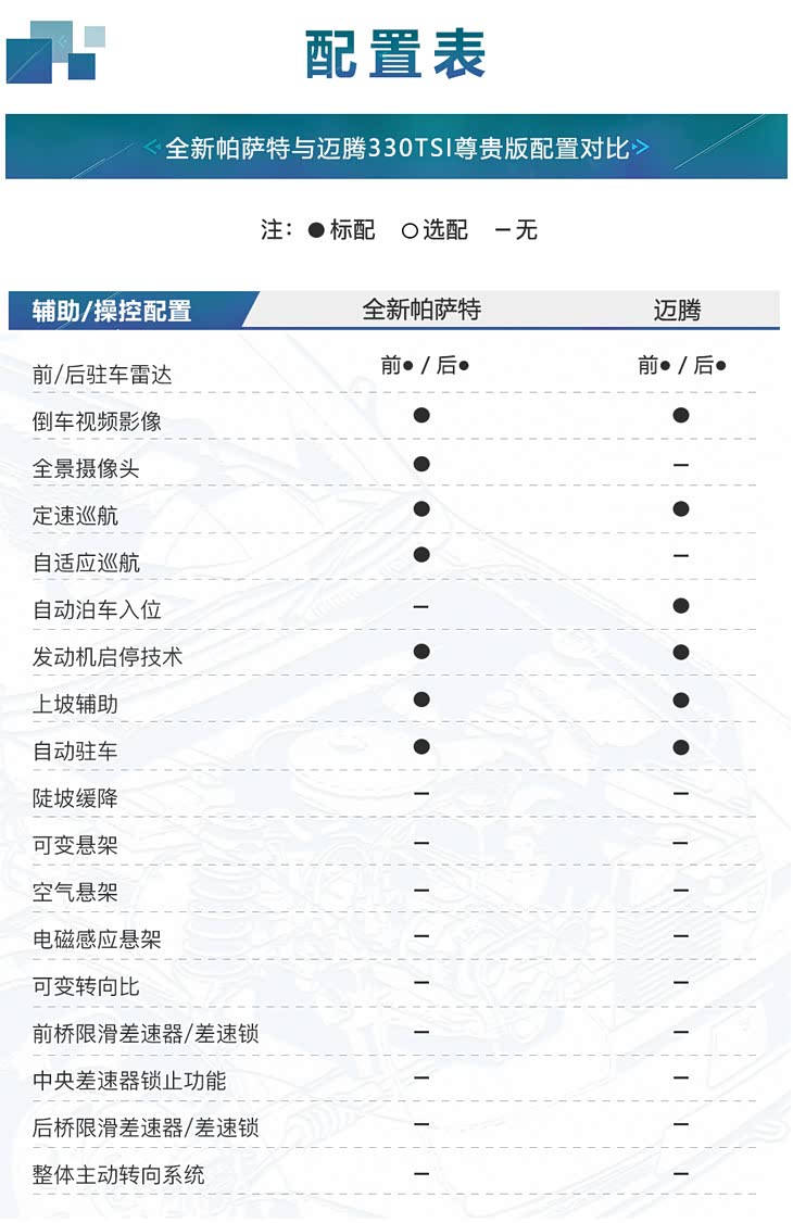 2019款330TSI尊贵版全新帕萨特和2019款330TSI尊贵版迈腾在主/被动安全配置上,全新帕萨特并没有配备后排侧气囊,而迈腾则有后排侧气囊,膝部气囊上也是全新帕萨特缺少的。而在并线辅助、车道偏离预警和主动刹车/主动安全系统上,都是全新帕萨特领先于迈腾的配置,在疲劳驾驶提醒上,迈腾有所配备。辅助/操控配置上,全新帕萨特配全景摄像头和自适应巡航,而迈腾则配有自动泊车。