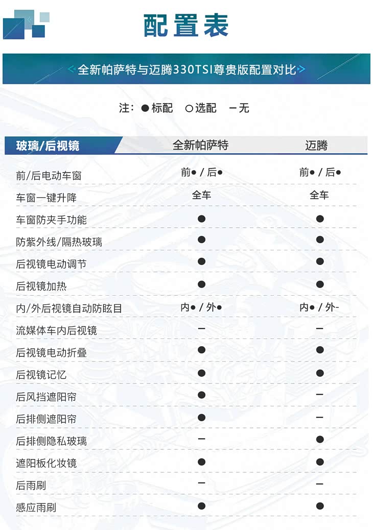 2019款330TSI尊贵版全新帕萨特和2019款330TSI尊贵版迈腾在多媒体配置中,全新帕萨特标配9.2英寸多媒体液晶屏,而迈腾标配8英寸,但是可以选装9.2英寸多媒体液晶屏。在灯光配置中,迈腾配有大灯清洗,全新帕萨特没有配备。在玻璃配置上,全新帕萨特要略胜迈腾一些,配有外后视镜自动防炫目、后风挡遮阳帘和后排侧遮阳帘,而迈腾只有内后视镜自动防眩目。此外,后排隐私玻璃也是迈腾车型配备的,全新帕萨特并没有后排隐私玻璃。