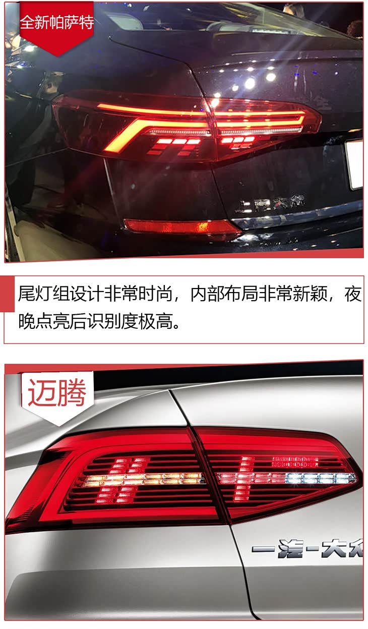 尺寸上,全新帕萨特与迈腾在轴距上均为2871mm,在车身尺寸上全新帕萨特要略胜迈腾。侧面线条上两款车型设计大同小异,并没有太突出的地方,而在尾部上全新帕萨特有着全新的样式,采用与辉昂同样的车名英文尾门居中样式,显得格外豪华。而迈腾则采用较为简洁的设计,并没有采用过多的装饰点缀。在尾灯组上两款车型均在内部灯带布局上有着新颖的设计,点亮后识别度极高。