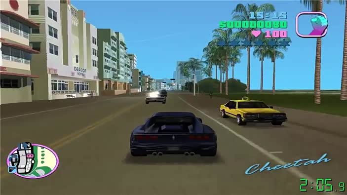 而在这款游戏中也出现了与故事背景相符的经典车型,其中就包括上图中这台名为Cheetah的蓝色跑车。记得当年在玩这款游戏时,我并不知道这台跑车的原版车型是什么,只知道这台车十分好开,外形也很帅,就经常去找这台车开。直到多年后我才发现到原来这台车就是八十年代法拉利的主推车型——Testarossa。
