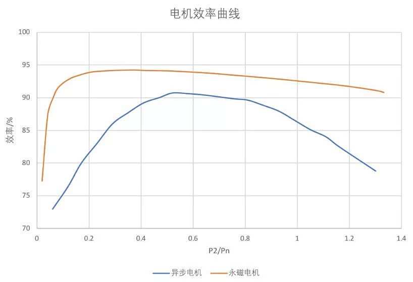 我们选择日常生活中大部分的行驶场景,中低速(电机维持在4000转)下的异步电机和永磁电机的电机负载率-电机能量效率曲线图(P2/Pn为电机负载率)。可以看到在中低速情况下,永磁电机比异步电机效率更高。