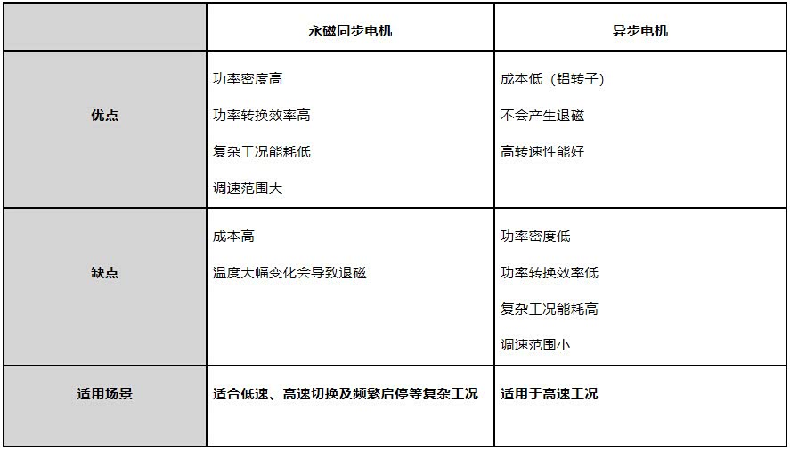 在同等功率条件下,永磁同步电机的体积更小、效率高,适合的路况也更丰富;而异步电机,成本低,高速工况下效率高。而随着永磁材料技术的不断进步,永磁同步电机在高转速方面也逐渐有了突破。所以在没有更新、更高效的技术出现之前,动力系统上应用永磁同步电机将会是大趋势。