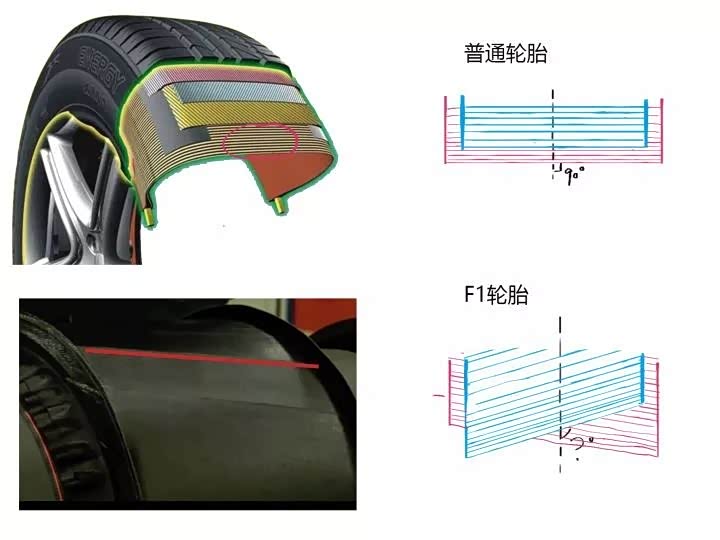 子午线轮胎以其胎体帘线角度与中心线成90°而得名,而F1轮胎的胎体帘线与中心线之间的角度并非90°,所以F1轮胎并非子午线轮胎,与普通轮胎有着本质上的区别。