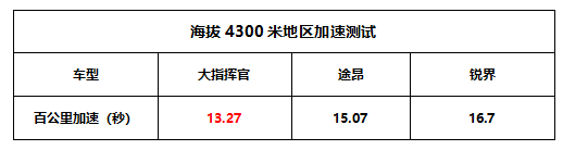 大指挥官身上搭载的这台2.0T发动机动力参数表现不错,尤其是扭矩表现。在海拔5200米、含氧量只有平原40%的珠峰大本营,大指挥官还与途昂、锐界来了一场百公里加速大比拼。在相同的驾驶人员和车辆配重情况之下,大指挥官的百公里加速仅有13.27秒,相比途昂和锐界,成绩要更加出众。