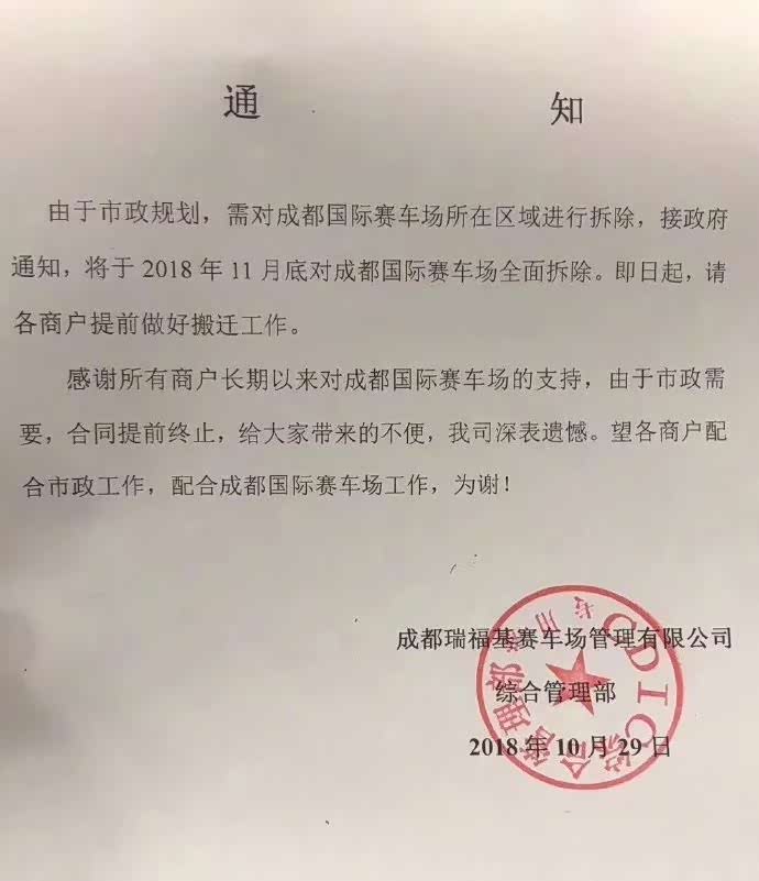 这是一份来自成都国际赛车场管理方的通知,上面清楚的写着由于市政规划,成都国际赛车场所在区域将在2018年11月底进行全面拆除。