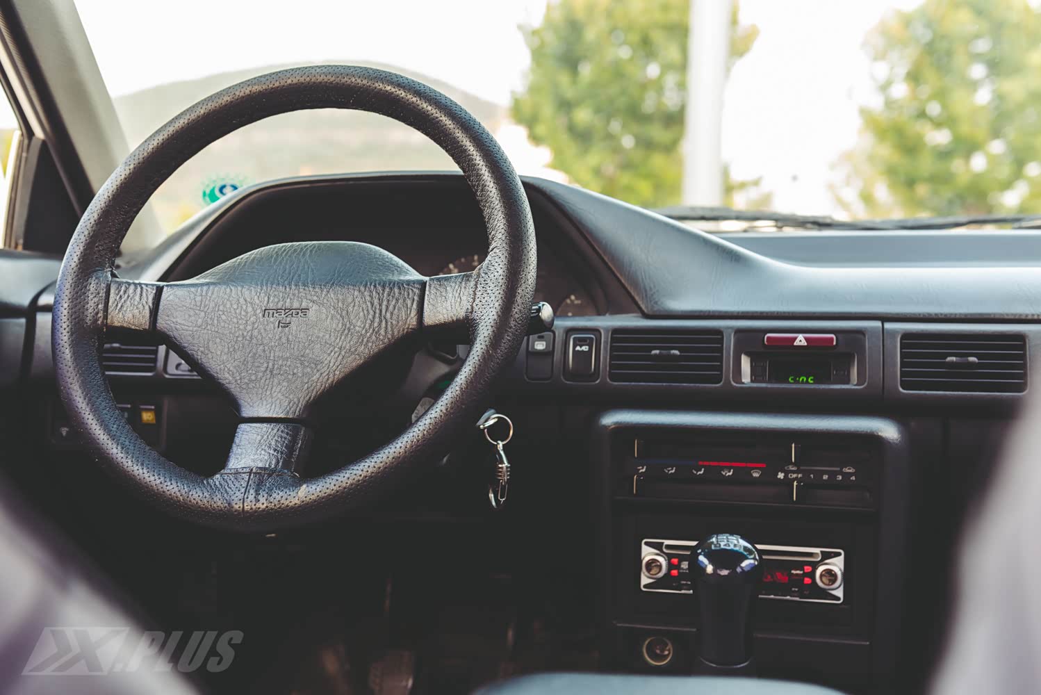 我这台323是台标配车型,比高配少了天窗/真皮座椅/后座中央扶手还有后备箱上面的尾翼,其他基本都一样,前后雾灯,手动空调,手动座椅,没有安全气囊和ABS,但是厚厚的车身钢板让我一直觉得这是台很结实的小车。对了,还有个那个年代必须加装的一个高科技娱乐产品10碟的索尼CD机。那音质,现在听着还是高潮不断!