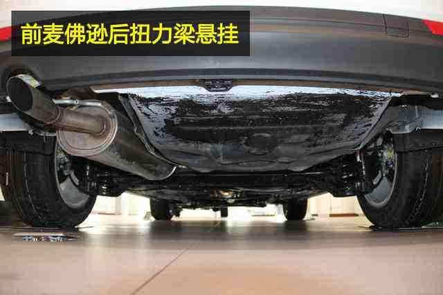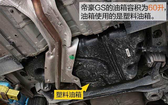 从汽车底盘上分析,帝豪/帝豪GS底盘结构简单,总体保护的板件比较少,略显单薄,优点是前扭力梁悬架在底盘构架上非常稳固耐用。从下面图片能清楚看到,帝豪GS的排气管走势弯曲无规则。底盘对油箱的保护欠缺,底盘略显空洞。