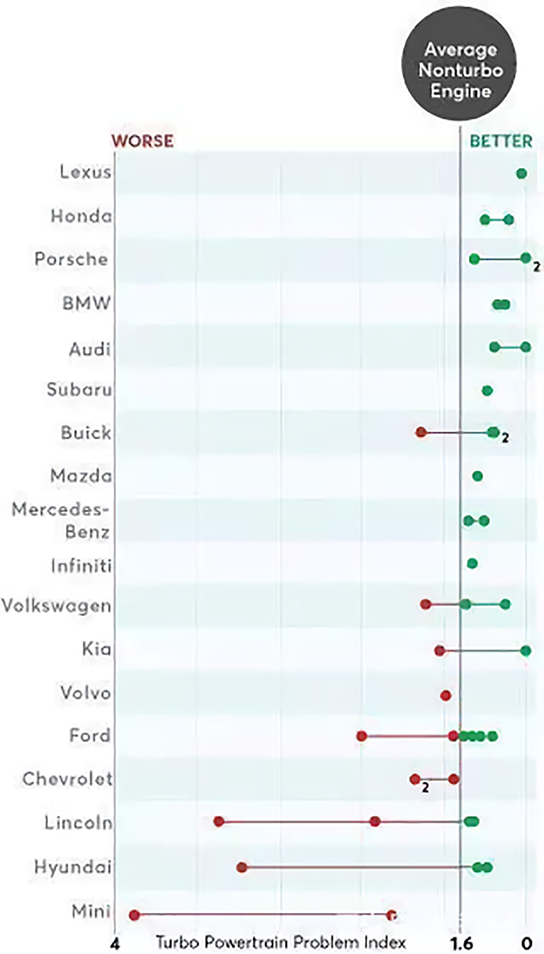 雷克萨斯、本田、保时捷、宝马、奥迪、斯巴鲁、马自达,奔驰以及英菲尼迪,涡轮增压发动机均比“非涡轮增压发动机”平均水平更可靠。