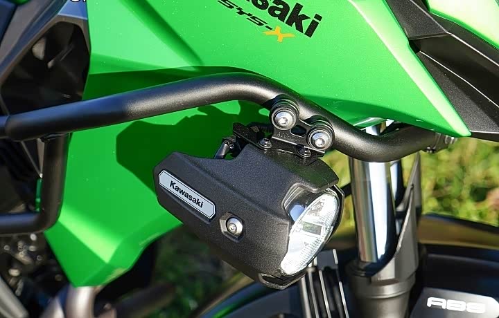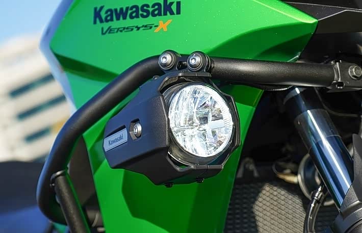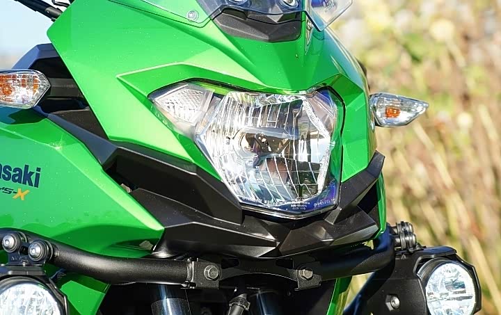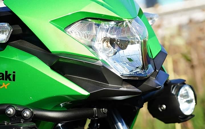 Versys X-300 Tourer大灯采用卤素灯具,造型有些神似Ninja 250SL的单灯风格,大灯灯泡前方有一个特别设计的金属罩,大灯下方则有相当帅气的棱角造型,与新款Versys650、Ninja400有异曲同工之妙,两侧保险杠上各有一个LED雾灯,雾灯周围也有塑料的保护罩,车头两侧的方向灯为卤素灯泡,另外,、大灯上方的透明风挡也能在巡航时降低风压带来的不适。
