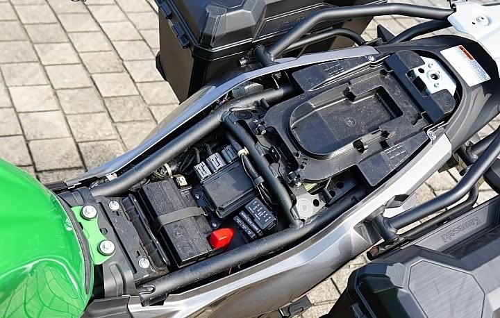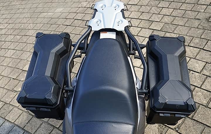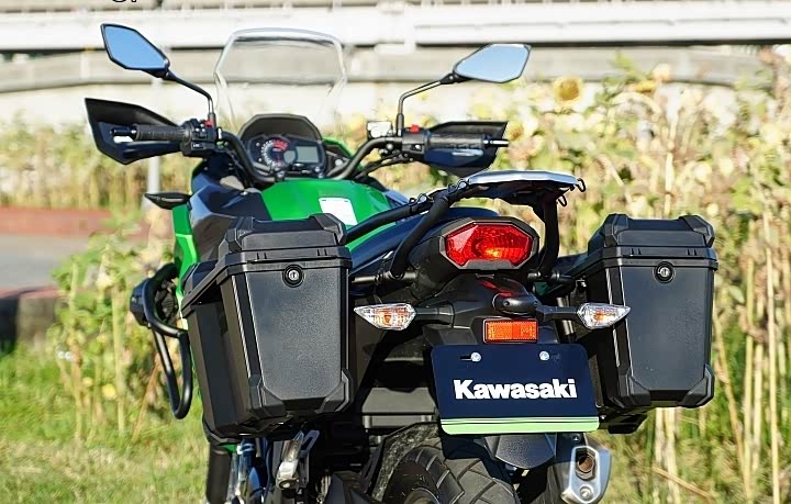 前半段不断提到Versys X-300 Tourer标配的侧箱,这两具原厂侧箱为雾面塑料材质,并且可以用车辆的钥匙上锁或开启,开启方式为90度由后向前开启,侧箱的盖子上也可以看到川崎的厂徽,侧箱的容量虽然没办法置入头盔,但一般的包包、衣物与防摔手套要放进去可说是绰绰有余,侧箱的四周也有防刮的保护块,若不幸在土路倒车不会直接伤到侧箱。