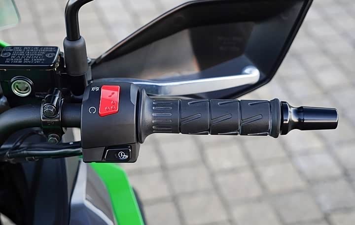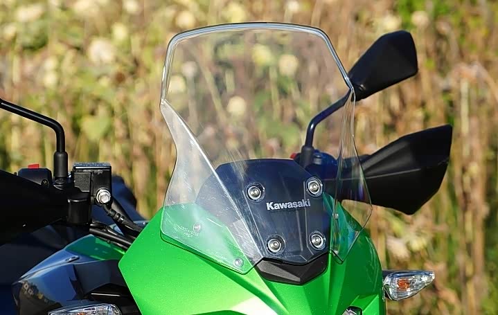 从骑士视角看去Versys X-300 Tourer相当具有红牌重机的气势,宽大的车手把与透明风挡也让骑乘视野更为开阔,仪表板采用单色液晶屏幕搭配指针转速表的设计,仪表板左侧为DC12V车用充电埠,仪表板右侧为原厂雾灯开关,两侧把手控制界面与一般车款相同,但左侧把手多了相当实用的驻车灯,手把两侧的平衡端子则比一般车款还要长。