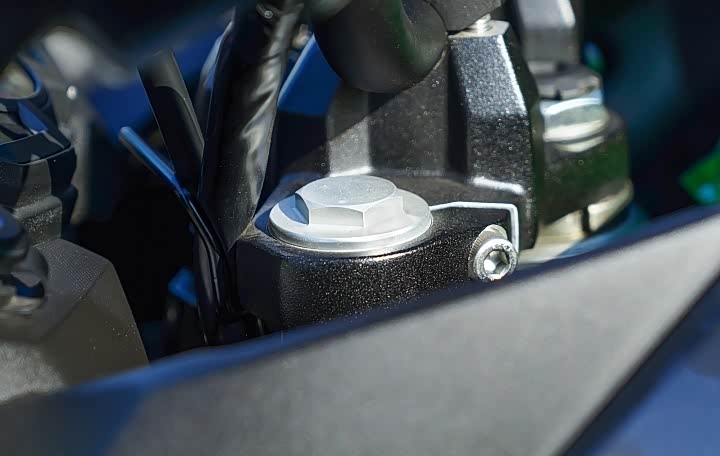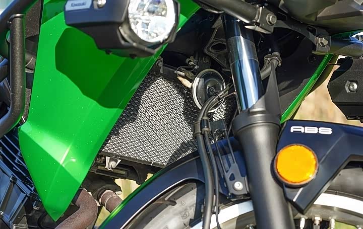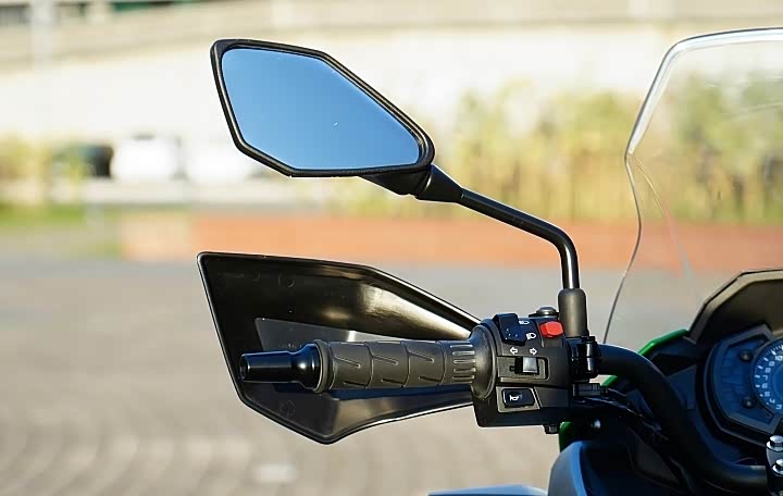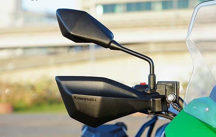Versys X-300 Tourer标配的塑料护弓造型与后视镜相同,五角形后视镜采用单球台调整机构,下方的护弓前方打了川崎的厂徽,两侧拉杆都采用银色金属材质,且都不具有拉杆间距调整的功能。