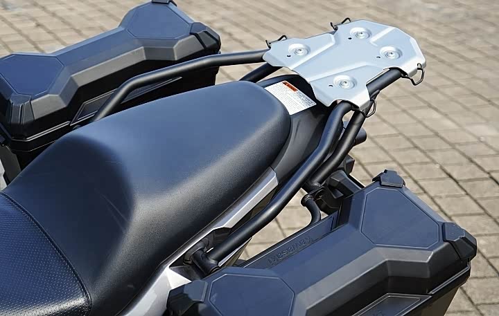 因为原厂标配了侧箱,钢管制的后箱架当然也是标配,除了用来固定侧箱之外也兼具后扶手的功能,最后方还有一个金属制的平面空间以及共四处的挂环,方便依照个人需求搭配弹力绳来固定其他行李。
