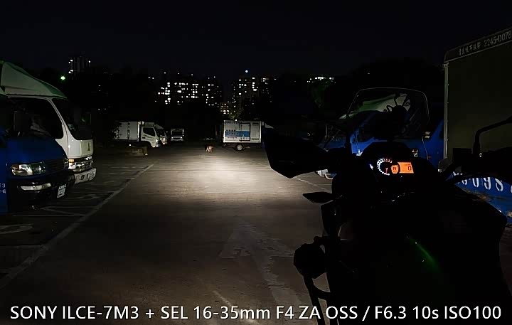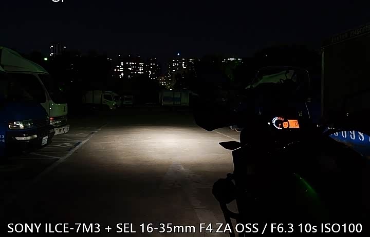 大灯照射范围实际拍摄,亮度透过相机设定调整至与最接近现场观看的亮度来做比较;Versys X-300 Tourer的卤素大灯亮度依照现代标准仅能算是堪用,但因为标配了LED雾灯,在近灯搭配雾灯的状态下亮度非常足够,开启远灯后车头前方的地面也能透过雾灯来补足,所以在光源不足的夜间荒野中雾灯会相当实用。