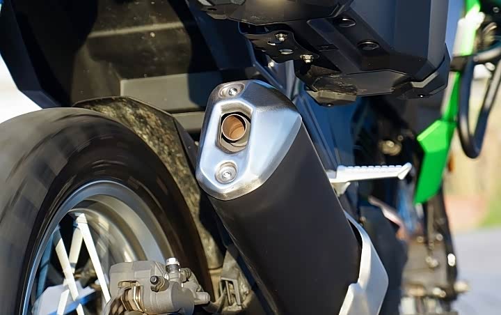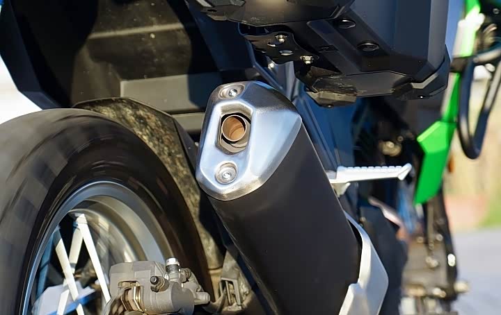 排气管造型与Ninja400也非常相近,都是侧置式单出排气管,采用金属消光黑的管身材质,侧面有银色发丝纹质感的防荡盖,尾段的排气管口周围也是银色的装饰材质。