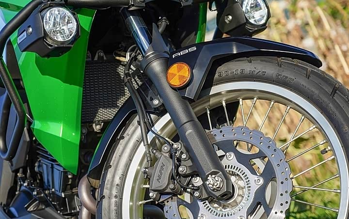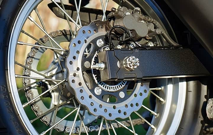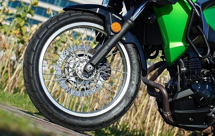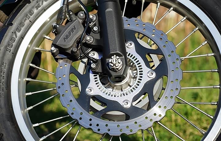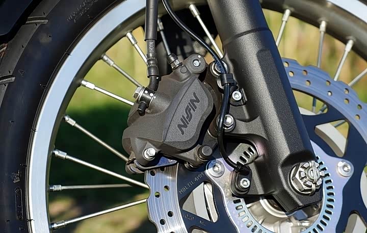 前轮部分使用19寸钢丝轮框(尺寸100/90-19),刹车系统为NISSIN单向双活塞浮动卡钳搭配290mm固定碟盘,刹车碟盘内侧有用于ABS防锁死刹车系统的霍尔效应感应盘。