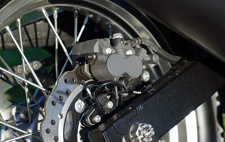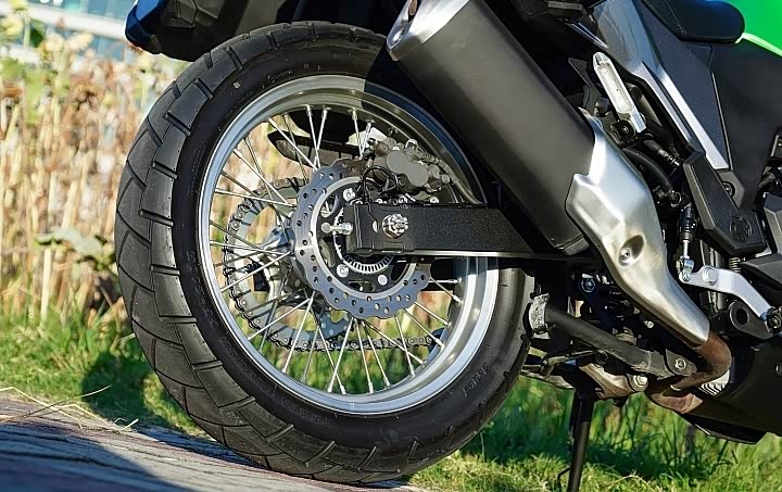 后轮尺寸为130/80-17,与前轮一样使用钢丝轮框,后刹车使用NISSIN单向双活塞浮动卡钳搭配220mm固定碟盘,并搭载ABS防锁死刹车系统,后摇臂较Ninja300略长,轴距也因此来到1,450mm。