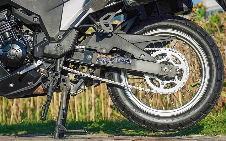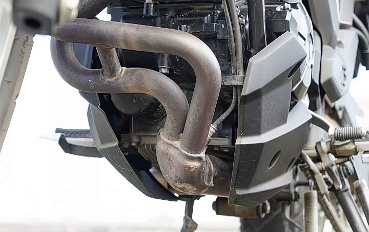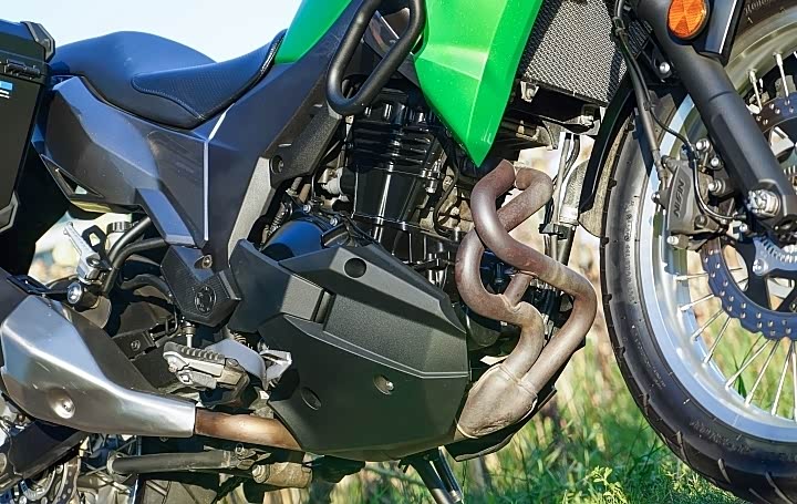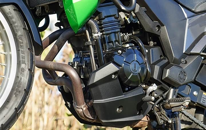Versys X-300搭载300c.c.并列双缸水冷引擎,规格上与之前的Ninja300相同,在11,500转可以发挥出40ps最大马力,最大扭力数据则是25Nm@10,000rpm,并具备辅助&滑动式离合器与双节流阀的技术,虽然与Ninja400的动力相比较为弱势,但对于入门级多功能车款来说,300c.c.引擎的动力对新手反而较容易掌控,引擎侧面有塑料的引擎护罩,能避免引擎在倒车时受损,但引擎下方没有任何护板,在较恶劣的地形里排气管前段有直接被石头撞到的可能。