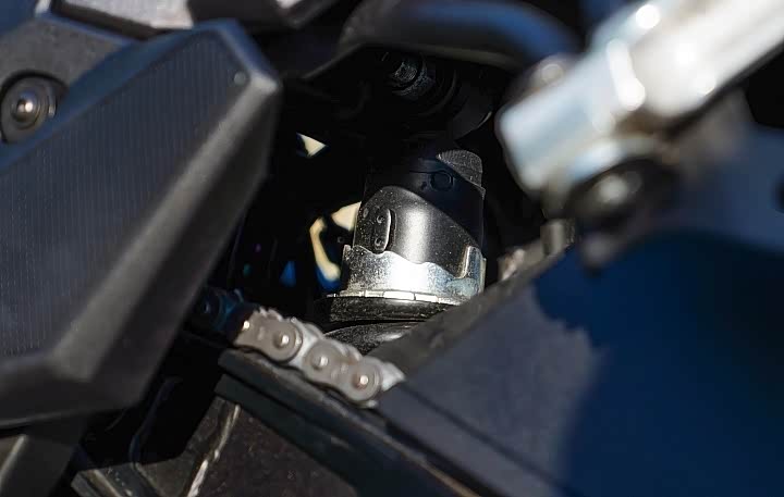 前悬挂为41mm正立潜望式前叉,做动行程为130mm,前叉中间有塑料档片阻挡溅起的泥土,能延长前叉油土封的寿命,从前叉顶盖能看出其不可调整的设计,黑色的前挡泥板上也标示了ABS防锁死刹车的记号。