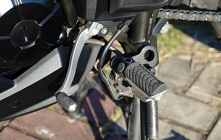 两侧脚踏采用较简单的设计,若不幸在越野过程中受损要修复的成本较低,脚踏的上方都有用于止滑与减震的黑色橡胶垫,金属刹车踏杆上也有齿状的止滑纹路,后座脚踏为全金属材质,脚踏本身可以收折,内侧也有协助固定的金属小翅膀。