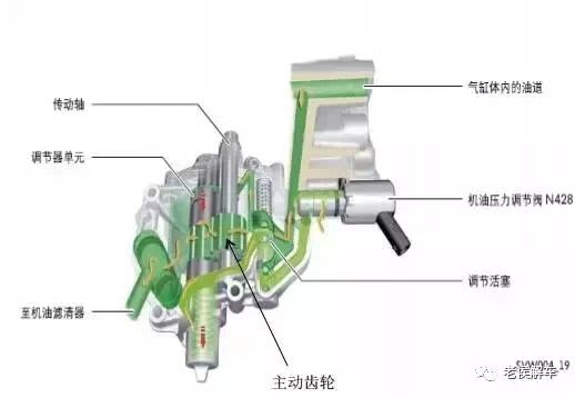 机油压力控制阀N428负责向调节式机油泵的调节**提供油压。它位于气缸体后部并由发动机管理系统ECU操作。