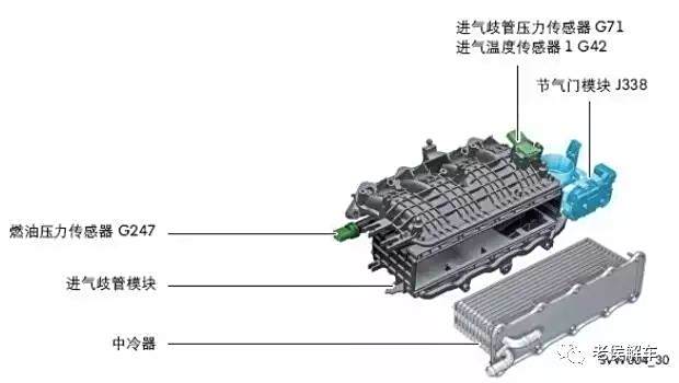 进气系统由带有谐振腔的进气管、空气滤清器、节气门控制单元、带增压空气冷却器的进气歧管及气缸盖的进气口组成。在进气系统将产生振动并将引起噪音,本发动机在进气管内设置了谐振腔能有效降低噪音。发动机控制单元通过进气压力传感器G71和进气温度传感器G42获取发动机的进气量。