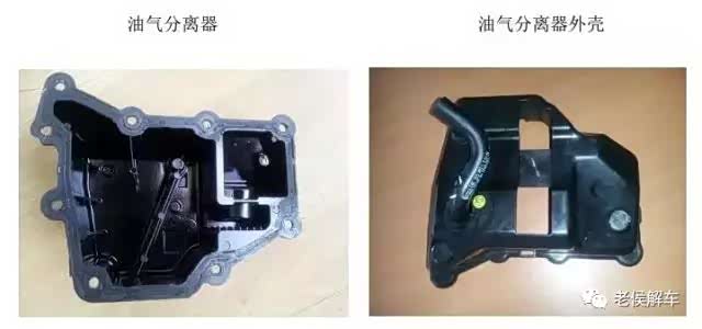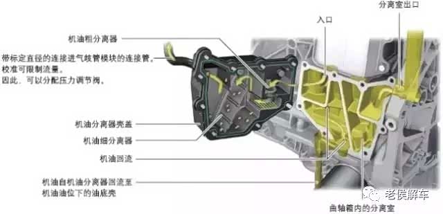 气体从曲轴箱进入机油分离器。大油滴首先被粗分离器中的隔板和涡流管道分离。然后,微小的油滴通过细分离器中的隔板除去。