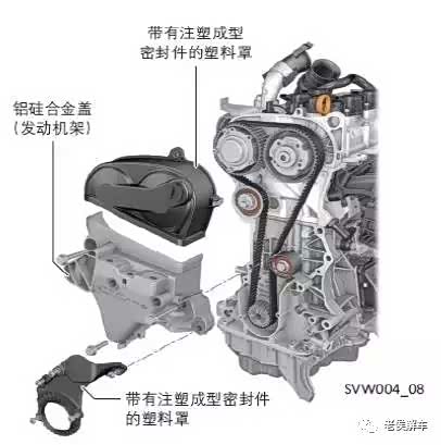正时罩盖由EA111发动机的整体式铝压铸件改为三个零件组成,两个塑料件一个中间罩盖铝压铸件,减轻了重量。