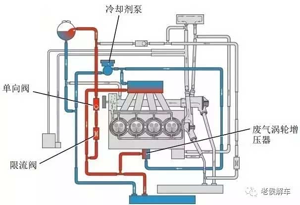冷却系统分为增压空气冷却系统(如前面进气系统所述)和缸体缸盖的冷却系统,该部分讲述的为缸体缸盖冷却系统,两套冷却系统通过节流阀和单向阀的控制基本上不互相流通。
