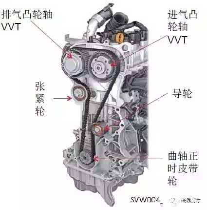 由齿形皮带带动曲轴和凸轮轴转动,进排气凸轮轴上都装有VVT进行调节,发动机带有废弃涡轮增压器。
