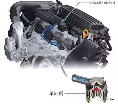止回阀根据进气系统中的压力控制被分离过的曲轴箱气体的循环。发动机怠速或低速运转时进气歧管中为负压时,真空效应会打开进气歧管的阀并关闭涡轮增压器进气侧的阀。随着发动机转速提高,涡轮增压器工作时进气歧管内为正压力,则压力将关闭进气歧管内的阀。同时,涡轮增压器进气侧的阀被预设的压差打开。气体通过涡轮增压器再进入燃烧室燃烧。