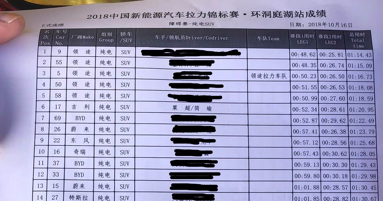 对,没有看错,笔者这么辛辛苦苦比赛,结果场地障碍赛被领途(御捷)车队包揽了前五名,对方驾驶没有正式上市销售的路试车型,并且由对方车队工程师驾驶参赛,完胜参赛所有量产纯电SUV车型(在场地加速赛中,有一台领途成绩比蔚来还快)。该车型具体信息可以查看宋楠老师微信公众号“换个角度看车市”,里面有对该车的研判分析。