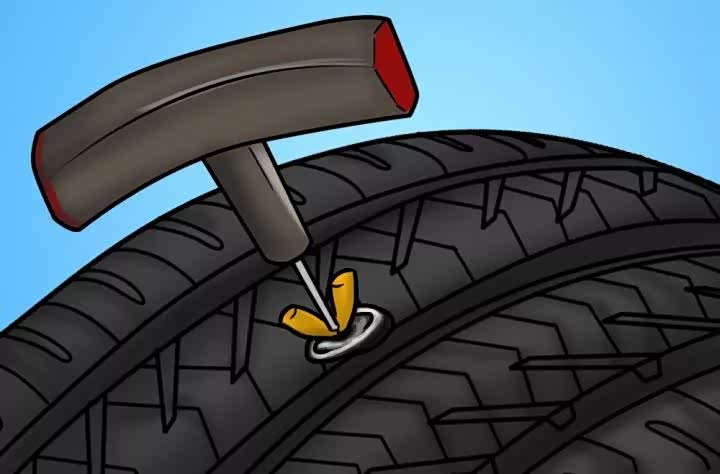 具体操作方法是,先用补胎专用锥子刺入轮胎破损的洞口处,然后将涂满胶水的橡胶条填充轮胎破损处。待胶水凝固后,给轮胎充气,并用肥皂水涂抹在胶条周围,检查有无漏气现象。最后用刀片将露出胎外部分的胶条削掉,确保轮胎的外部平整。