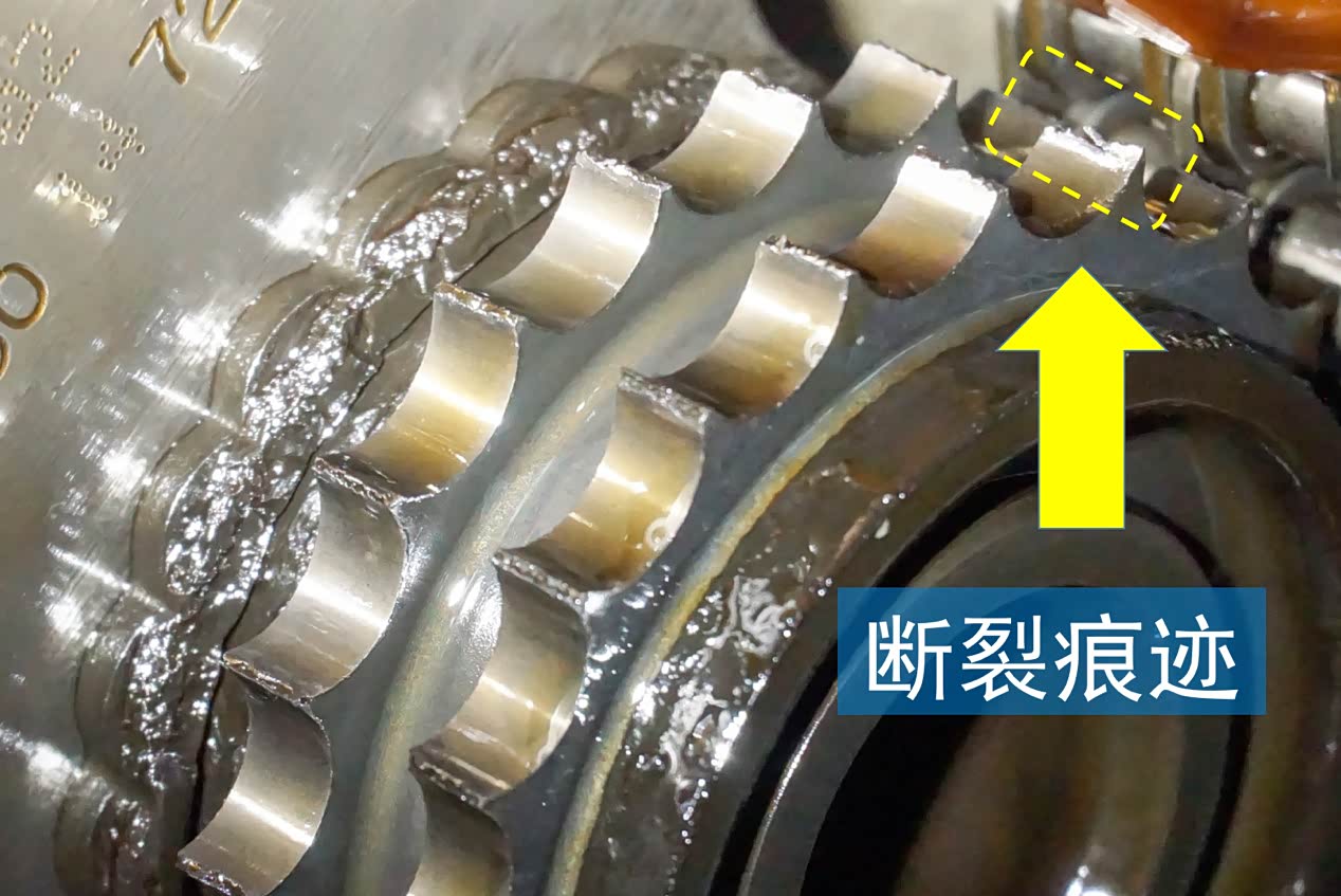 除了圆周方向,链轮还有径向上的磨损。这个磨损会让齿内凹的地方变得更“深”,相当于让链轮变小了,导致链条不能完全绷紧。当然这主要是个示意图,实际没有这么夸张,但肯定是会失去一定张紧能力的。最后就会在前文提到的红色位置附近断裂,也就在链轮上形成了我们看到的参差不平的断面。