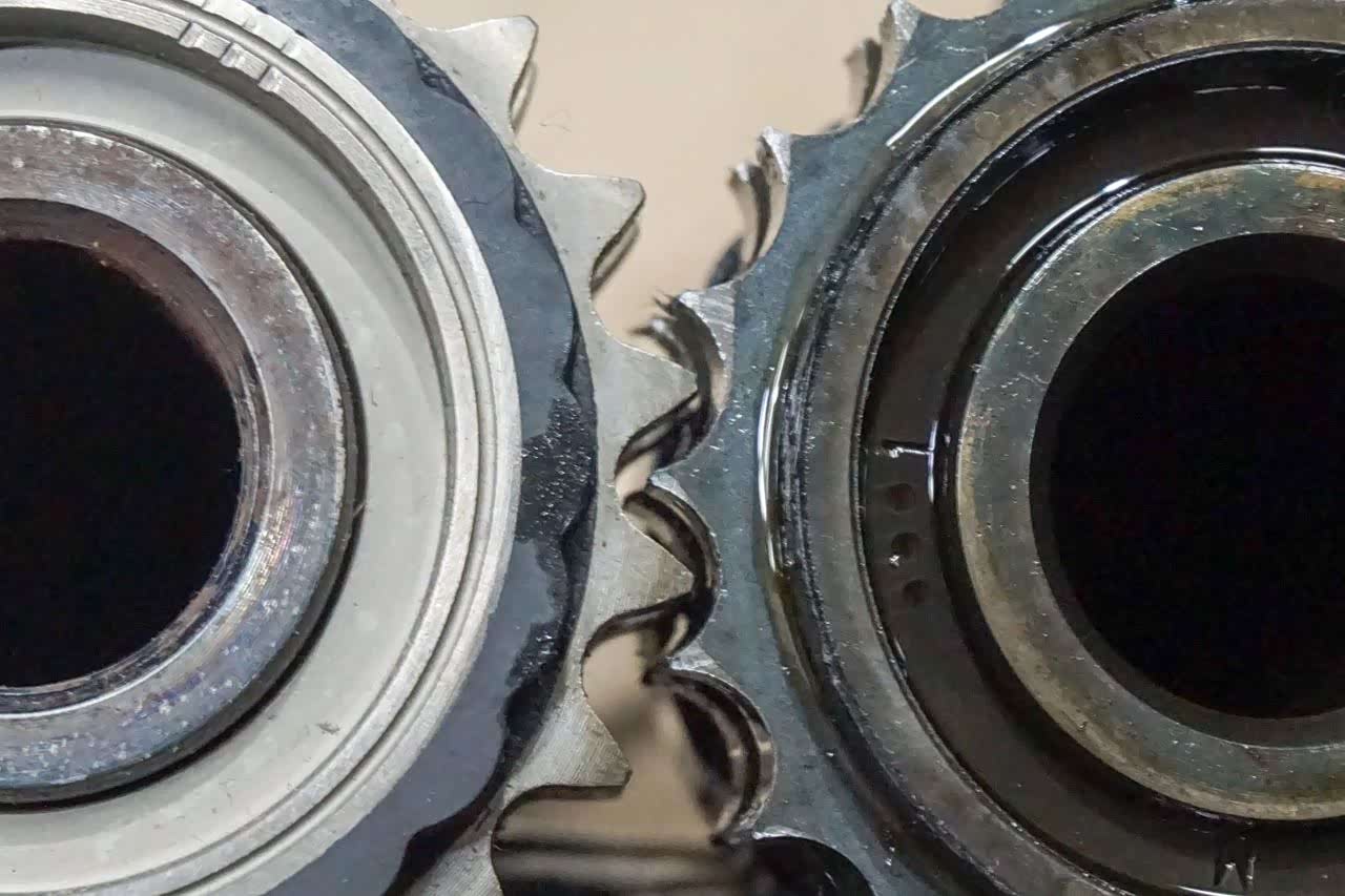 左新右旧,新链轮上部有一圈波纹样式的黑色部件,而右侧链轮的早已不翼而飞,化作了文章开头小油底壳内我们看到的那些不规则碎片。
