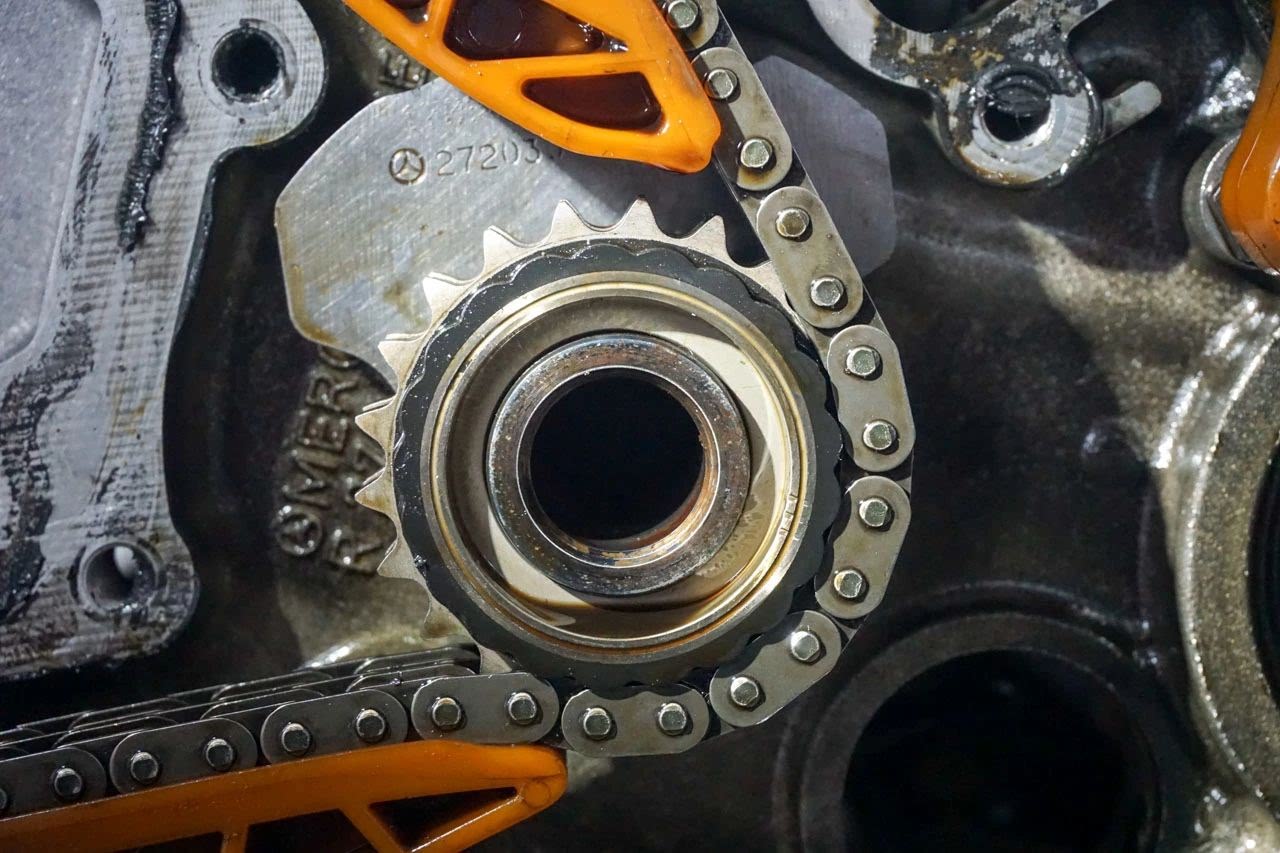 M272的平衡轴靠正时链条驱动,算从动轮,它还带着两块配重,转动起来还是有相当惯性的。而发动机在运转过程中转速会不断上升下降,链轮要反复地被链条加速减速,这就导致链轮齿的两侧都会被接触磨损到。