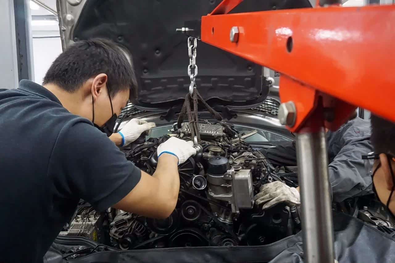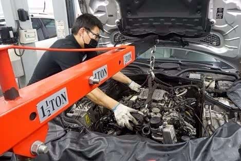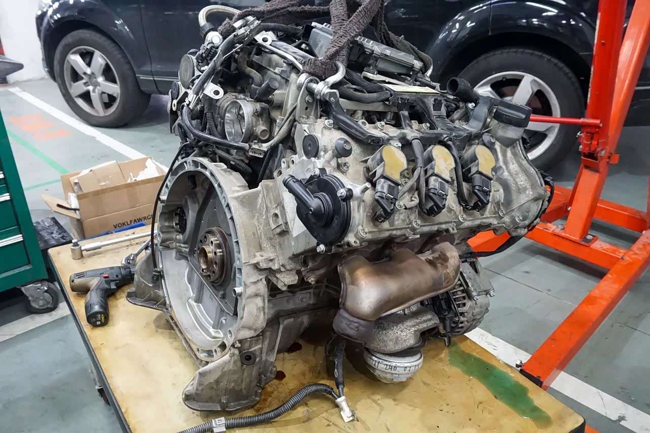找到问题所在就有了方向,不过解决起来稍微费点力,M272的平衡轴在发动机的V形夹角内,长长的一根穿过发动机,在机舱里无法直接进行更换,需要将发动机“请”出来。
