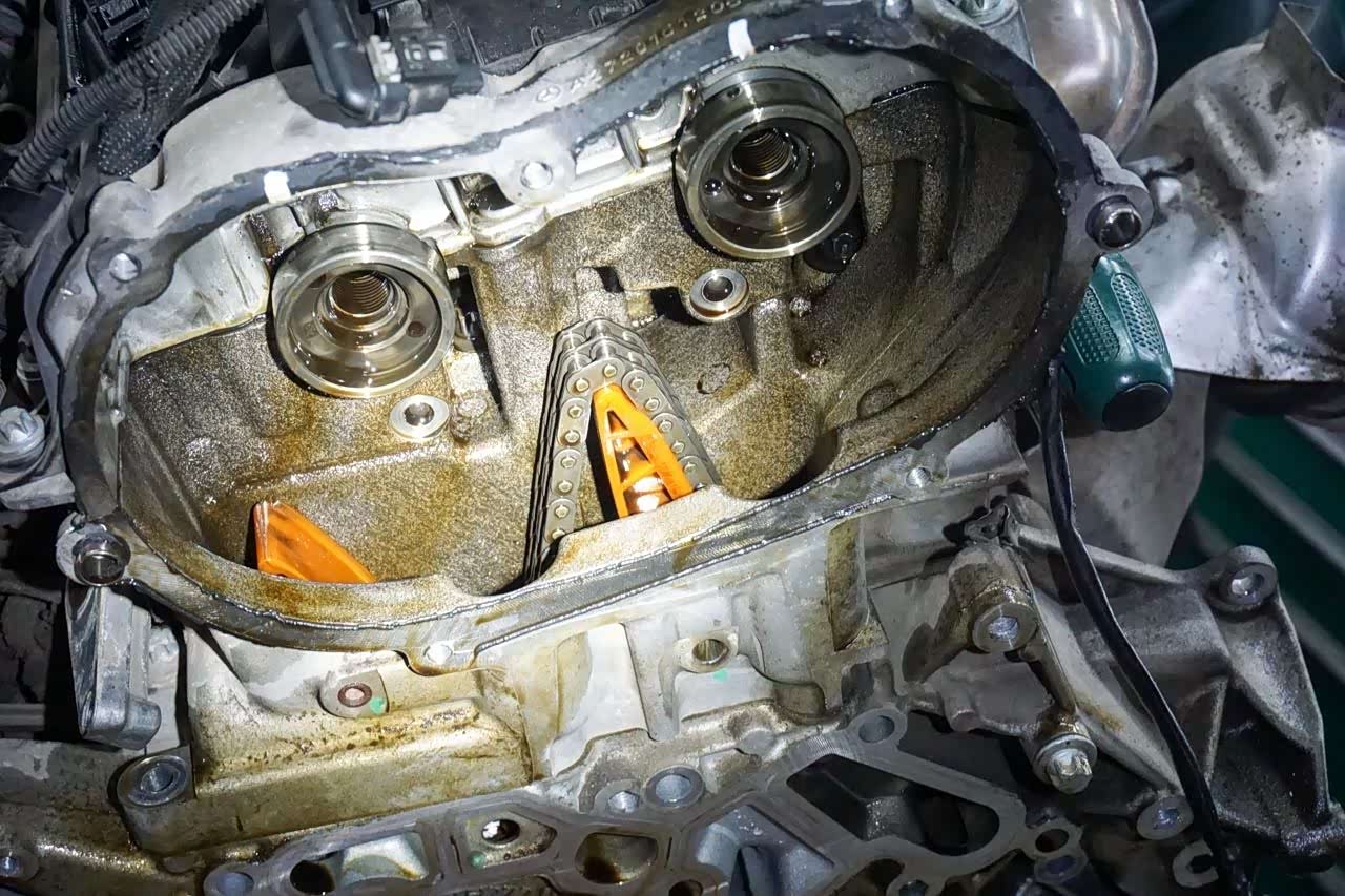 脱落的齿尖,这些东西残留在发动机里可不是什么好事。除了油底壳里的,正时盖板里的各部位也都要仔细检查一遍,确保完全清理。