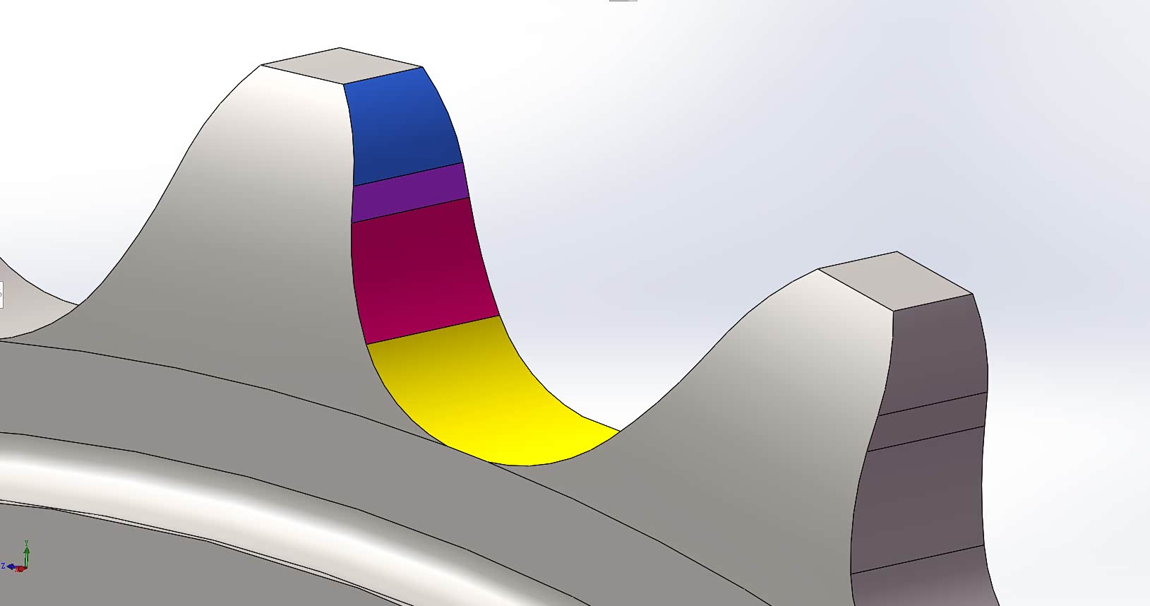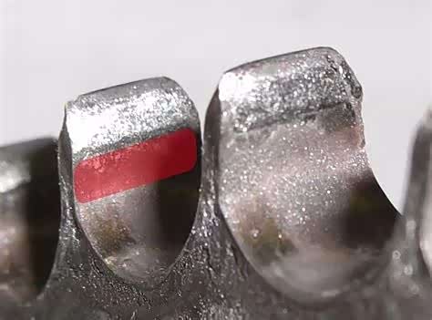圆周方向的磨损表现就是每个齿的厚度被磨的越来越薄,积累到一定程度就会变成类似图中这种状态,和正常的齿型比较起来已经显得很薄弱了,红色就是可能断裂的区域。