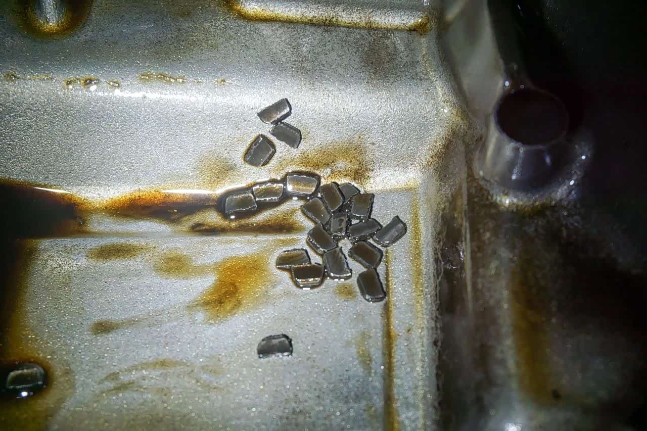 当然还需要些东西来帮助确诊,这需要拆下小油底壳寻找关键证据——这些零散的碎片。其中较大、不规则的是类似橡胶的材质;而较小、泛着光泽的是金属材质,大小形状还基本一样。有了这个基本就能确定是平衡轴的故障了,至于怎么来的?我们继续往下看。