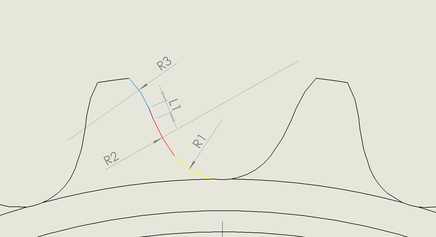一般来说,从端面来看正常的链轮齿型是由3段圆弧和1段直线平滑连接构成。