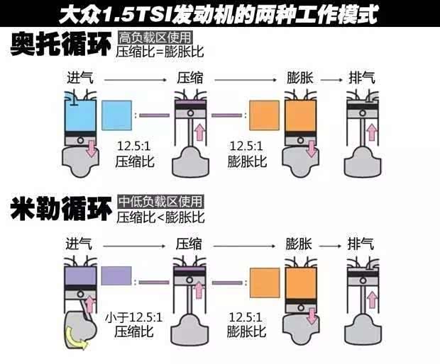 米勒循环其实与阿特金森差不多,都是膨胀比大于压缩比,只不过实现的方法不一样。米勒循环采用的是气门早关实现,在进气行程结束前,提前关闭气门。相比与阿特金森循环,这样的方法在低负荷情况下能更省油,但在高负荷是会导致发动机功率不足,这也是为什么大众低功版发动机功率小,就是因为其用了米勒循环。