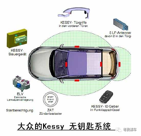 现在很多汽车采用了无钥匙进入和一键启动功能。这项功能非常的炫酷,只要把汽车的遥控器带在身上,接近汽车,不用操作任何按键,即可打开车门,进入车内发动汽车。由于操作简便,实用性强,所以一经推出,就受到了广大车主朋友的热捧,购车时非一键启动不选。那么这个无钥匙进入和一键启动功能究竟是怎么回事呢?今天老侯来给大家解析一下。各厂家的版本虽有不同,但基本原理是一样的,今天我就以大众的Kessy 无钥匙系统来说说它的结构与原理。