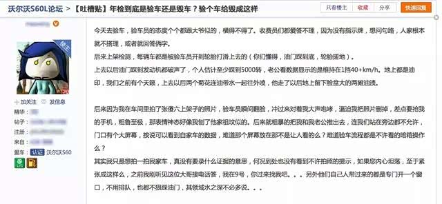 反观国内的验车,对于安全部分的检查似乎是流于形式。外观检查的重点是检验车辆是否与行驶证的登记照一致。至于尾气排放的操作方式,更是让车主觉得心痛。有些经历过把新车开去年检的车主,事后发帖把情况给阐述出来。当然了,正如“最快的车是借回来的车”的逻辑,上检测线的车都不是检测员自己的车,自然不需要爱惜。就算出现故障了,也不需要自己负责。