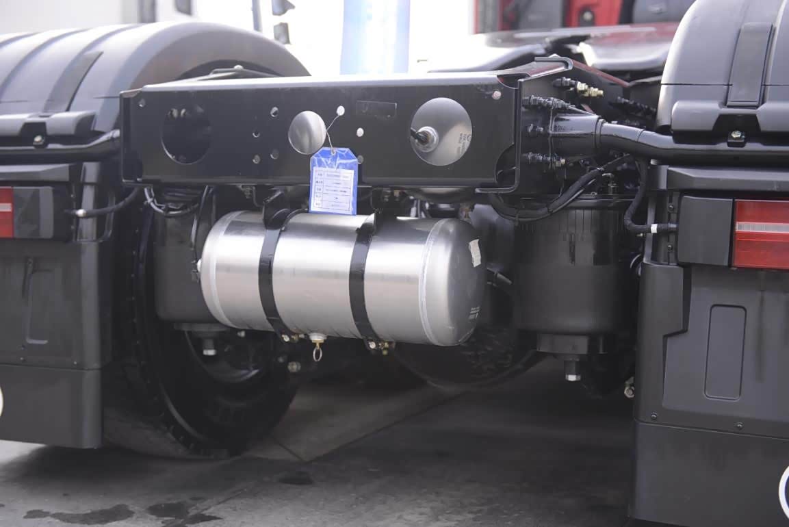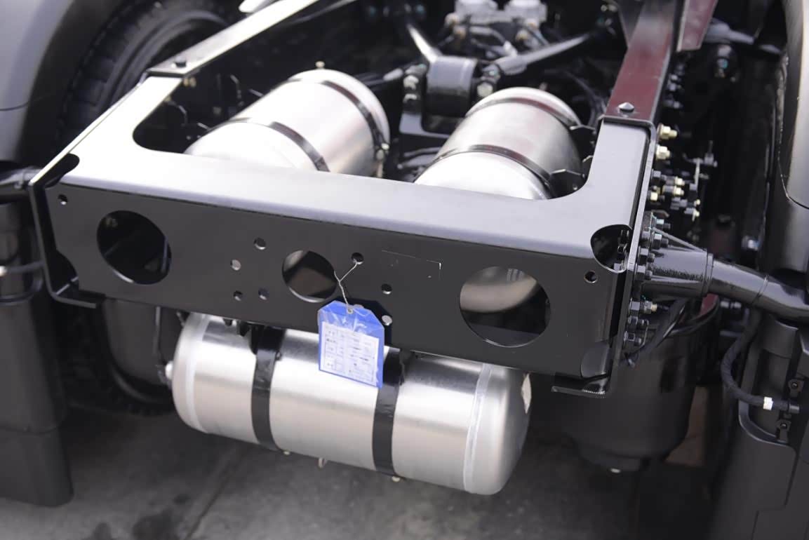 由于大梁左右两侧均安装油箱的原因,两个储气瓶集成到了传动轴的左右两侧,另外三个则集成到了车架尾部。由于零部件较多使得X6000的底盘布置非常紧凑,但是部件位置安放的还是比较合理。