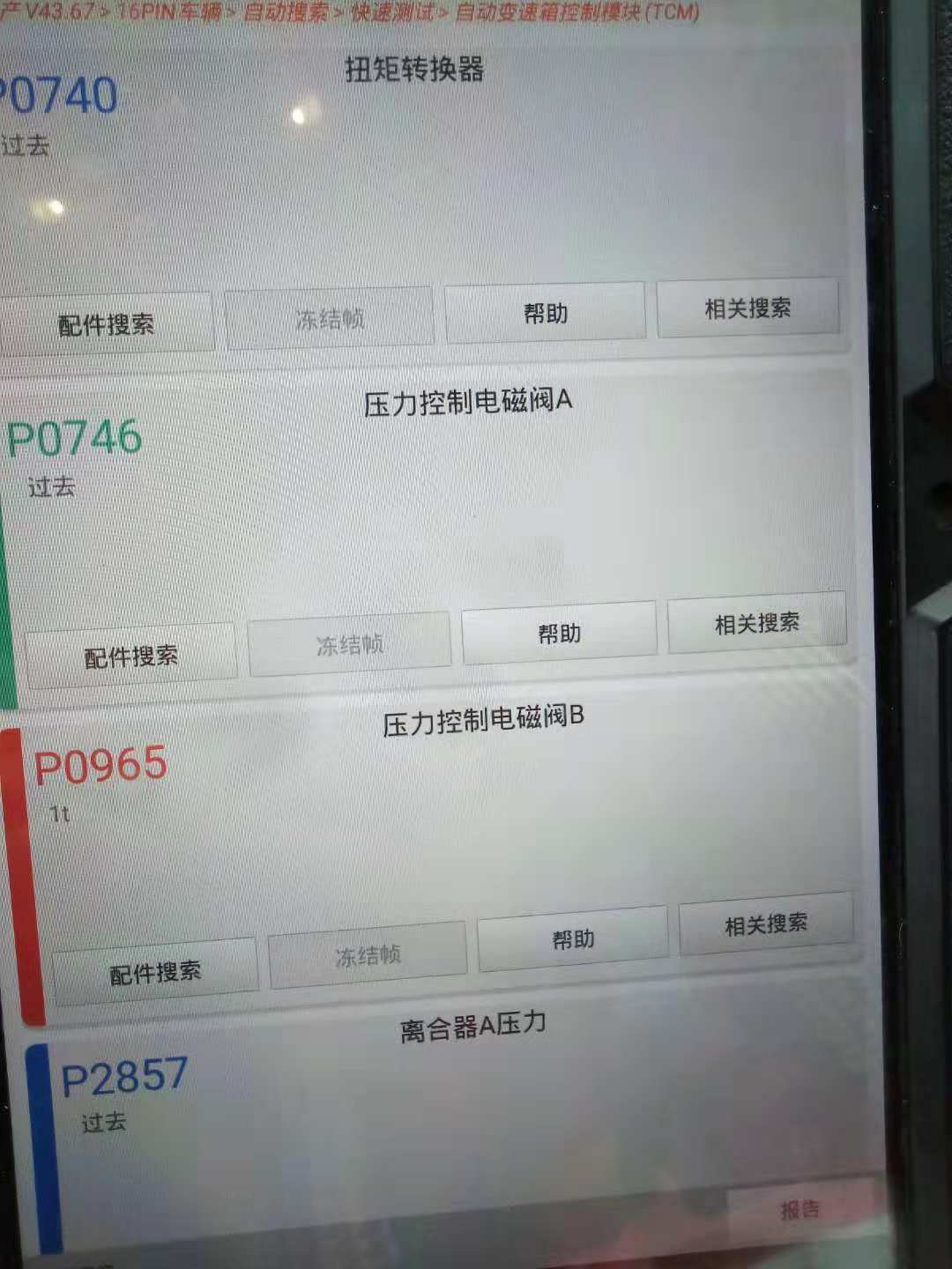 通过网络沟通,安排了专业技师带电脑上门去做了个检测,问题还真不少,阀体,变扭器,离合器……,之前保养时一直没换过变速箱油,在淘宝自己买的变速箱油,因为出保了也没去4S,买了油给了100工时直接在修理店换的。拖车进厂查油初步判断换了假油引起的。