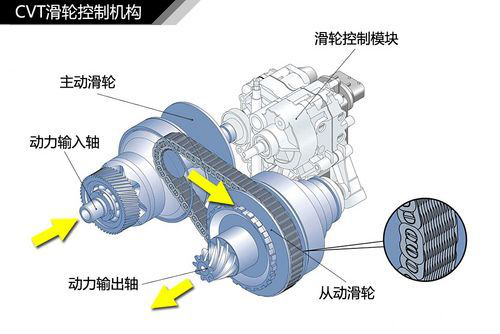CVT无级变速箱的主要部件是两个压力缸就是滑轮和一条金属带即链条,金属带套在两个滑轮上。滑轮由两块轮盘组成,这两片轮盘中间的凹槽形成一个V形,其中一边的轮盘由液压控制机构控制,可以视不同的发动机转速,进行分开与拉近的动作,V形凹槽也随之变宽或变窄,将金属带升高或降低,从而改变金属带与滑轮接触的直径,相当于齿轮变速中切换不同直径的齿轮。两个滑轮呈反向调节,即其中一个带轮凹槽逐渐变宽时,另一个带轮凹槽就会逐渐变窄,从而迅速加大传动比的变化