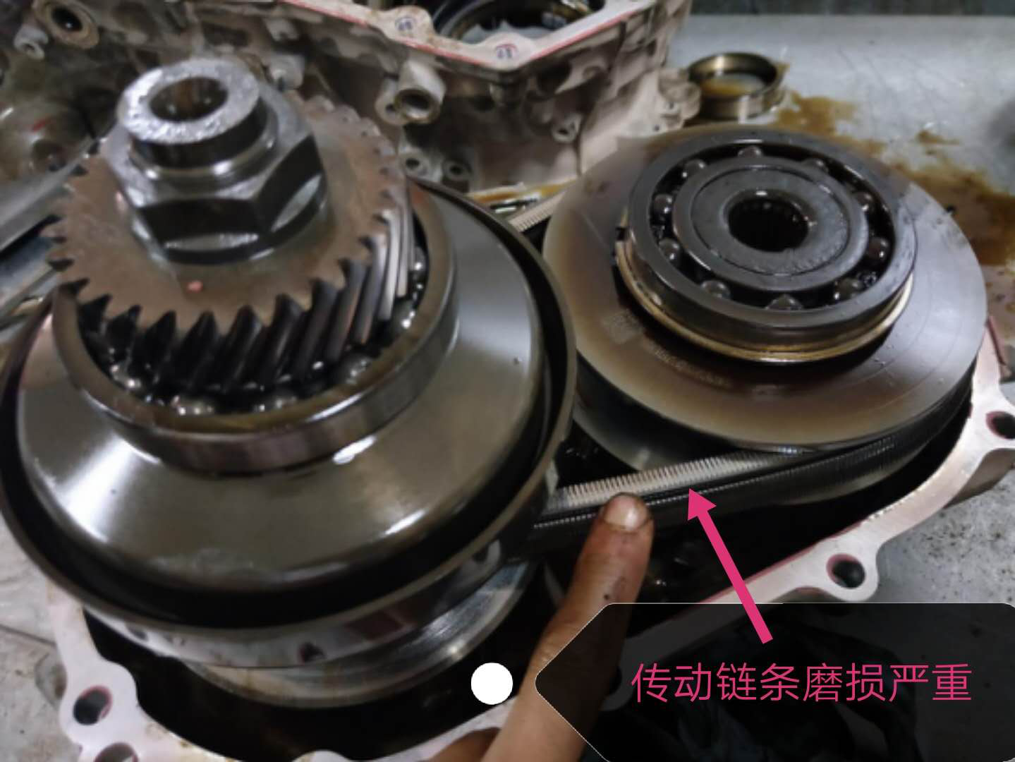 整个链条链轮系统拉缸了,离合器里面全烧了,轴承磨了,变扭器废了……这个变速箱没有维修的价值了,跟车主谈的更换一个再制造总成的方案。所以后期也没有跟拍了。