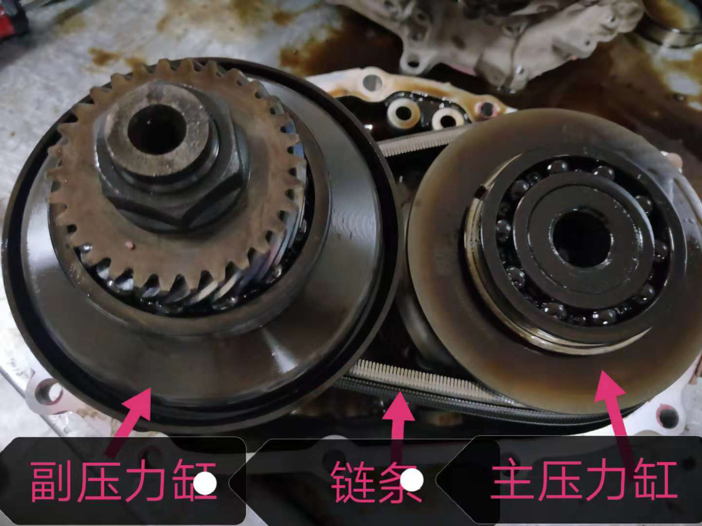 重要部件在这里了,CVT变速箱主要动力传输来源就是这2个压力缸,一个主缸,一个副缸,还一个链条,主要靠他们三个运转来实现速比的无极变化,这个两个缸表面都已经被里面脏脏的污泥染色了。主压力缸连接输入轴。副压力缸上面是差速器。缸拉了,轴磨了,差速器都转不动了,车子自然走不了了。